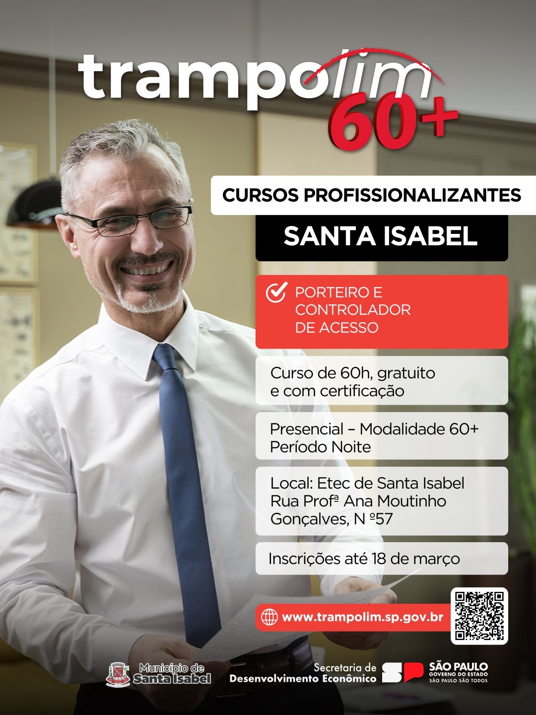 A Prefeitura de Santa Isabel, por meio da Secretaria de Turismo, Empreendedorismo e Desenvolvimento Econômico, em parceria com o Programa Trampolim SP, está com inscrições abertas para o curso gratuito de Porteiro e Controlador de Acesso, voltado para pessoas com 60 anos ou mais.